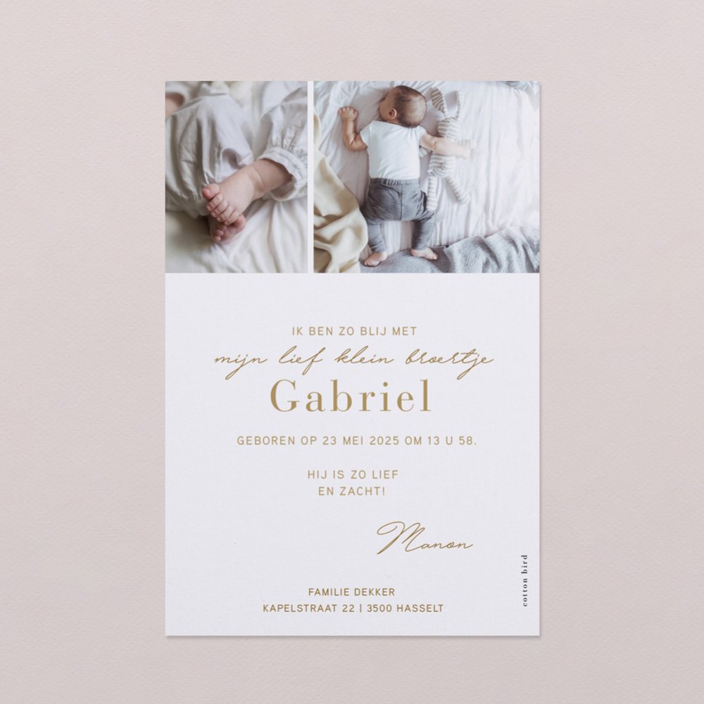 Eenvoud straalt met deze minimalistische geboortekaart waar alle aandacht gaat naar de mooiste foto's van jullie kindje. Afgewerkt met een touch of gold voor het aankondigen van een uniek moment als een geboorte met het model Caspar.