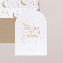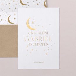 In het midden van de nacht, heldere sterrenhemel en nieuwe maan, kreeg jouw meisje of jongen met veel liefde zijn of haar naam. Deze originele geboortekaart Selenia met prachtige goudfolie kondigt met veel poëzie de geboorte van je dochter of zoon aan.