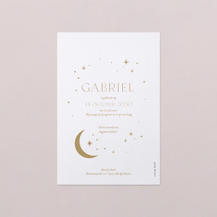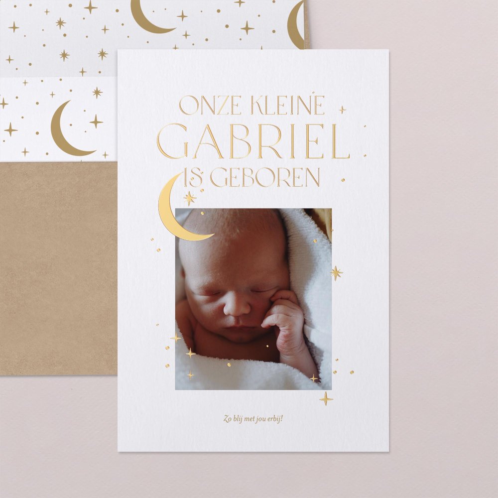 In het midden van de nacht, heldere sterrenhemel en nieuwe maan, kreeg jouw meisje of jongen met veel liefde zijn of haar naam. Deze originele geboortekaart Selenia met prachtige goudfolie en foto kondigt met veel po?zie de geboorte van je dochter of zoon aan. Dit gepersonaliseerde geboortekaartje kan je zelf online ontwerpen en bestellen met behulp van de editor.