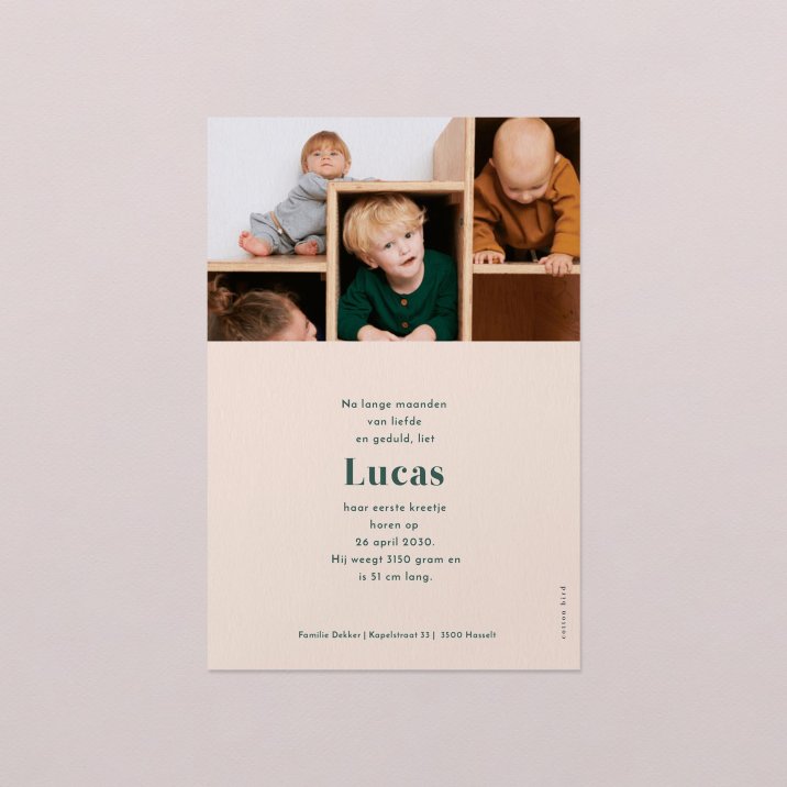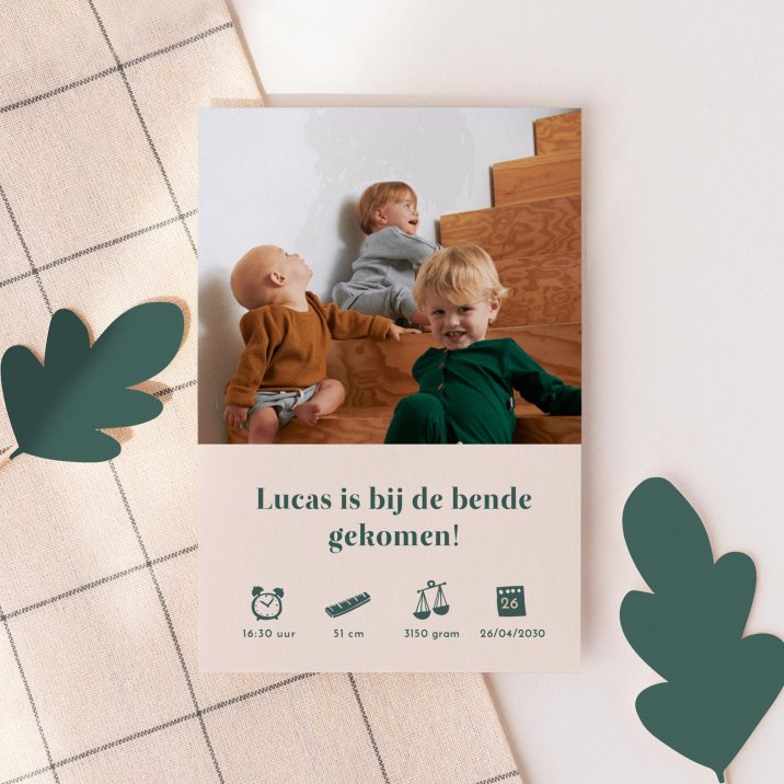 Deze geboortekaart is een enkele staande kaart, op beide kanten te bewerken met foto en tekst.