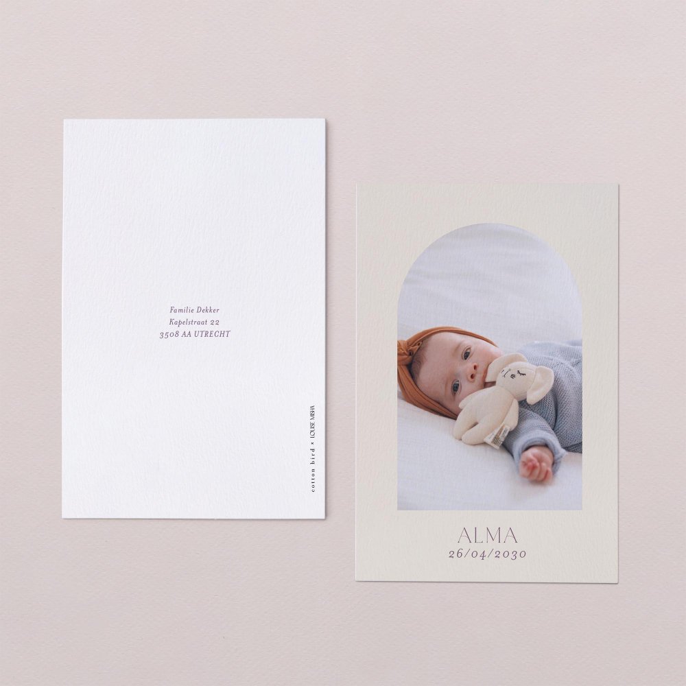 Unieke dubbele geboortekaart met een vensterraam. Ontdek bij het openvouwen een loszittend kaartje met de foto of persoonlijk berichtje.