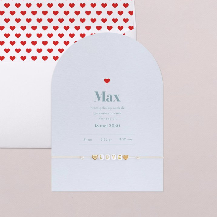 Dit geboortekaartje wordt gekenmerkt door zijn afgeronde bovenranden in de vorm van een boog en kan aan de voor- en achterkant worden gepersonaliseerd met de details van de geboorte van jullie baby.