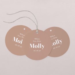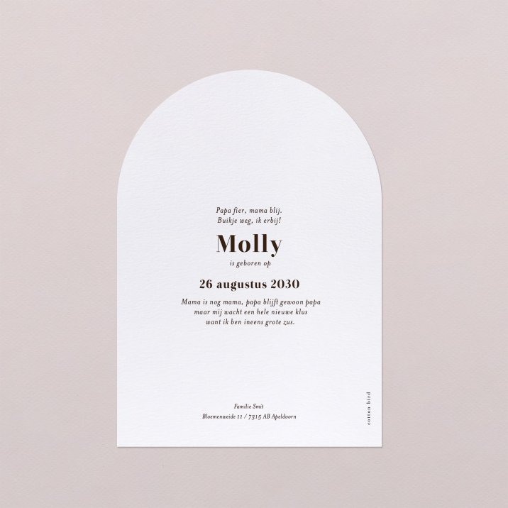Dit geboortekaartje wordt gekenmerkt door zijn afgeronde bovenranden in de vorm van een boog en kan aan de voor- en achterkant worden gepersonaliseerd met de details van de geboorte van jullie baby.