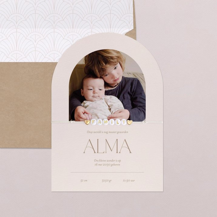 Dit geboortekaartje wordt gekenmerkt door zijn afgeronde bovenranden in de vorm van een boog en kan aan de voor- en achterkant worden gepersonaliseerd met de details van de geboorte van jullie baby.