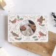 Op het geboortekaartje "Winter birdies" brengen schattige roodborstjes het nieuws: je kindje is geboren! Een model in kersttinten, teder geïllustreerd, perfect om je geluk te delen.