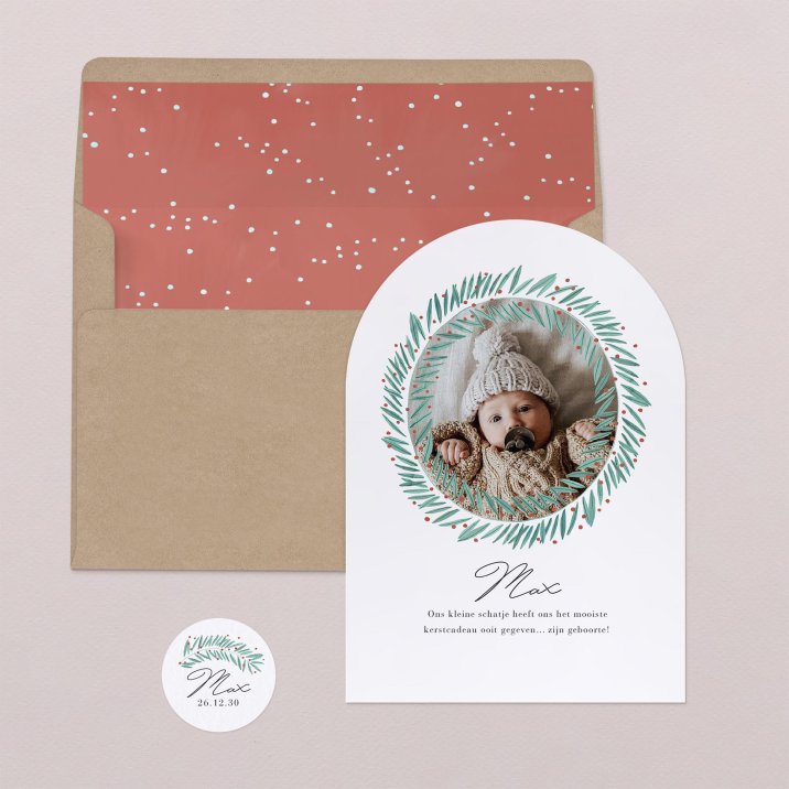 Op het geboortekaartje "Holy crown" siert een winterse plantaardige krans de mooiste foto van je kind. Modern en elegant deelt dit model je mooiste verrassing van het jaar.