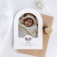Dit geboortekaartje wordt gekenmerkt door zijn afgeronde bovenranden in de vorm van een boog en kan aan de voor- en achterkant worden gepersonaliseerd met de details van de geboorte van jullie baby.