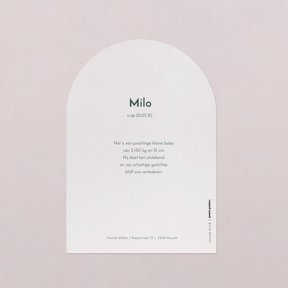 Dit geboortekaartje wordt gekenmerkt door zijn afgeronde bovenranden in de vorm van een boog en kan aan de voor- en achterkant worden gepersonaliseerd met de details van de geboorte van jullie baby.