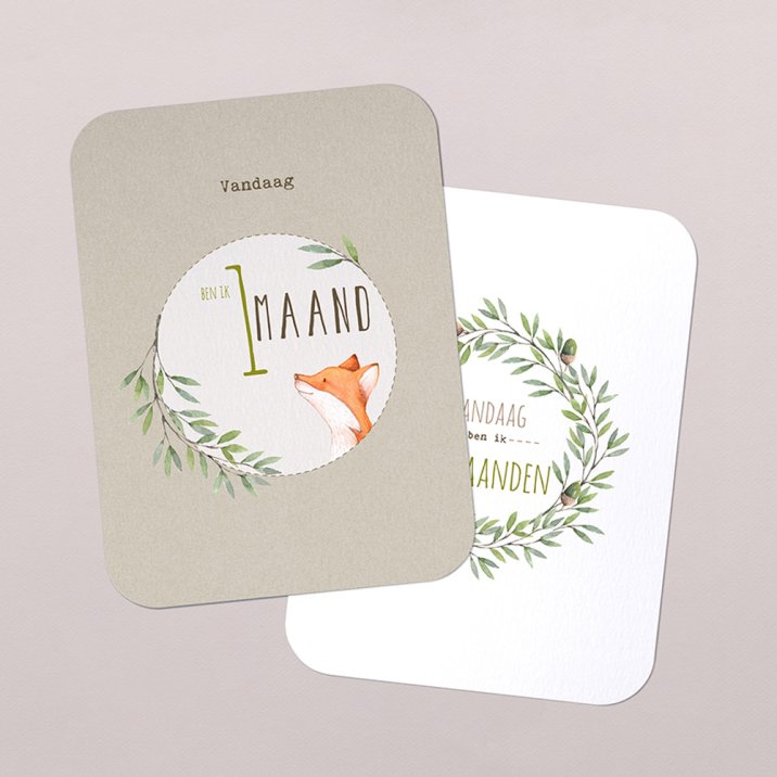 15 kaarten (van de 1e week tot het 1e jaar), geïllustreerd aan de voorkant. Aan de achterkant is er plaats voor een persoonlijke tekst waar je de groei van de baby en andere mooie momenten kunt vastleggen.