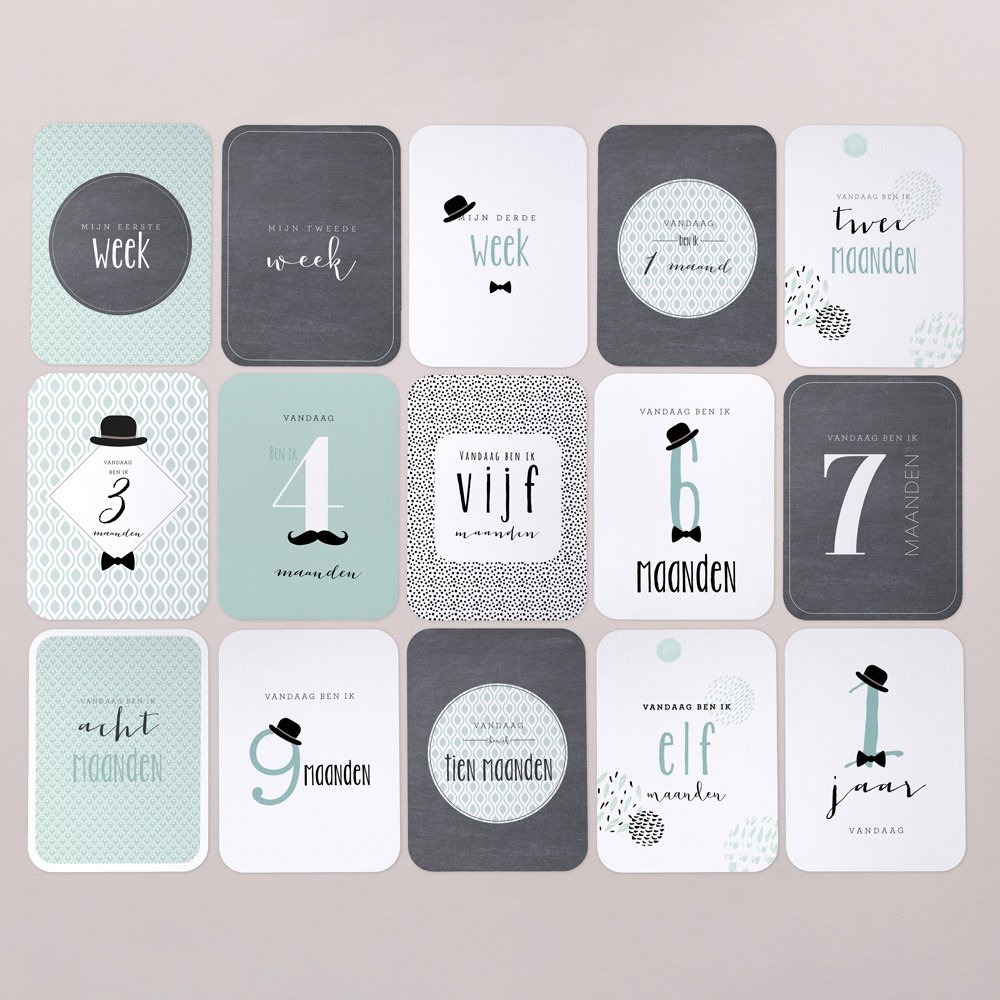 15 kaarten (van de 1e week tot het 1e jaar), geïllustreerd aan de voorkant. Aan de achterkant is er plaats voor een persoonlijke tekst waar je de groei van de baby en andere mooie momenten kunt vastleggen.
