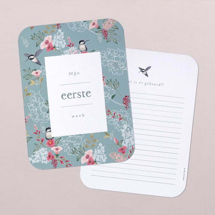 15 kaarten (van de 1e week tot het 1e jaar), geïllustreerd aan de voorkant. Aan de achterkant is er plaats voor een persoonlijke tekst waar je de groei van de baby en andere mooie momenten kunt vastleggen.