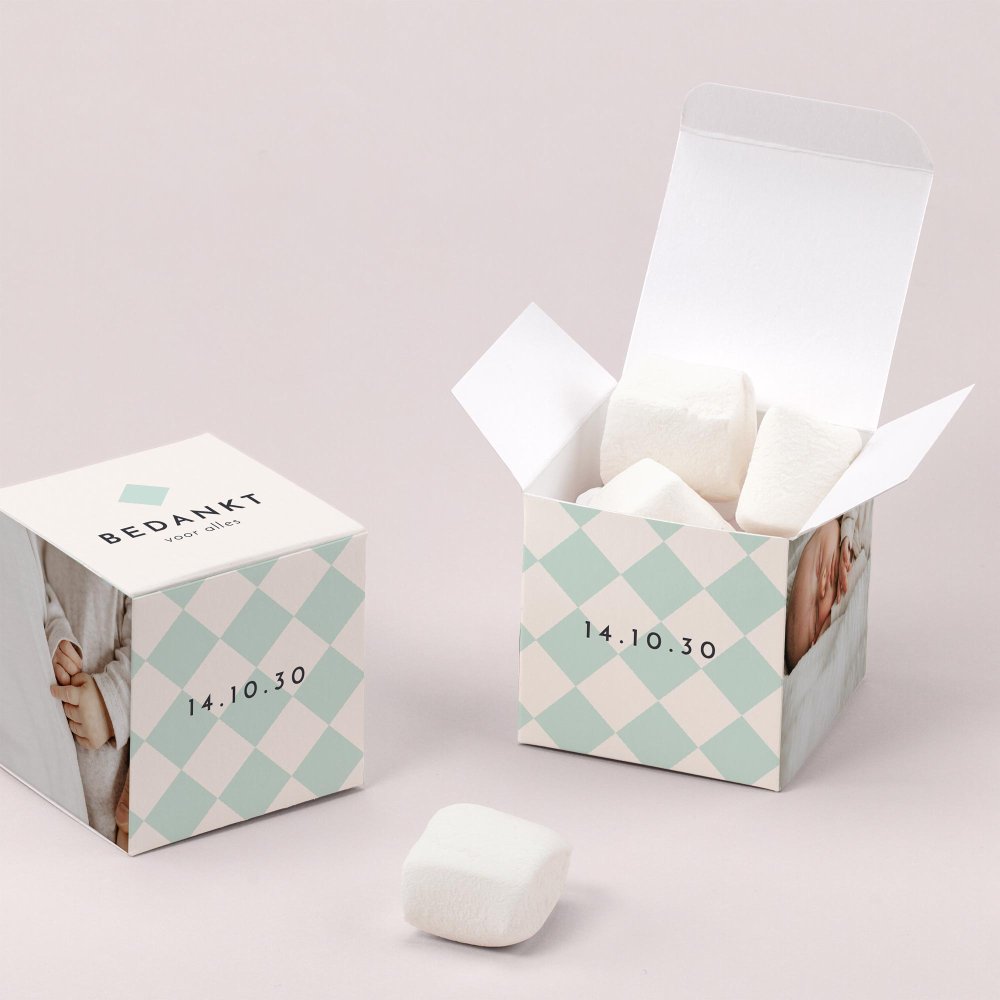 Een verrassingsdoosje als cadeautje voor je familie en vrienden, een mooie herinnering aan de geboorte van jullie kleine. Een kleine kubus van 5,4 x 5,4 cm waarin verschillende soorten lekkernijen kunnen. Laat je creativiteit de vrije loop!