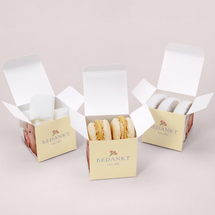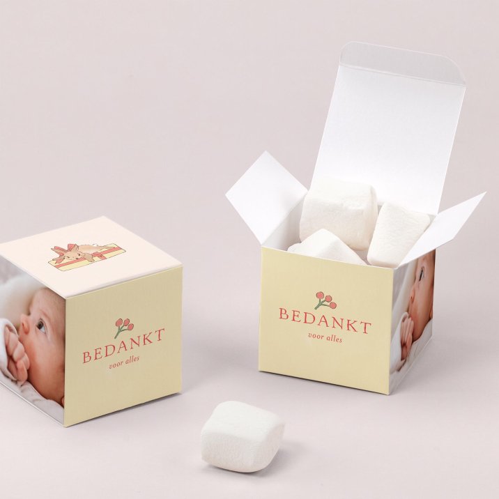 Een verrassingsdoosje als cadeautje voor je familie en vrienden, een mooie herinnering aan de geboorte van jullie kleine. Een kleine kubus van 5,4 x 5,4 cm waarin verschillende soorten lekkernijen kunnen. Laat je creativiteit de vrije loop!