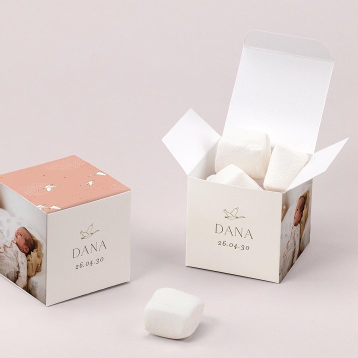 Een verrassingsdoosje als cadeautje voor je familie en vrienden, een mooie herinnering aan de geboorte van jullie kleine. Een kleine kubus van 5,4 x 5,4 cm waarin verschillende soorten lekkernijen kunnen. Laat je creativiteit de vrije loop!