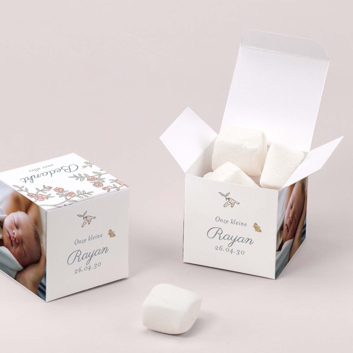 Een verrassingsdoosje als cadeautje voor je familie en vrienden, een mooie herinnering aan de geboorte van jullie kleine. Een kleine kubus van 5,4 x 5,4 cm waarin verschillende soorten lekkernijen kunnen. Laat je creativiteit de vrije loop!