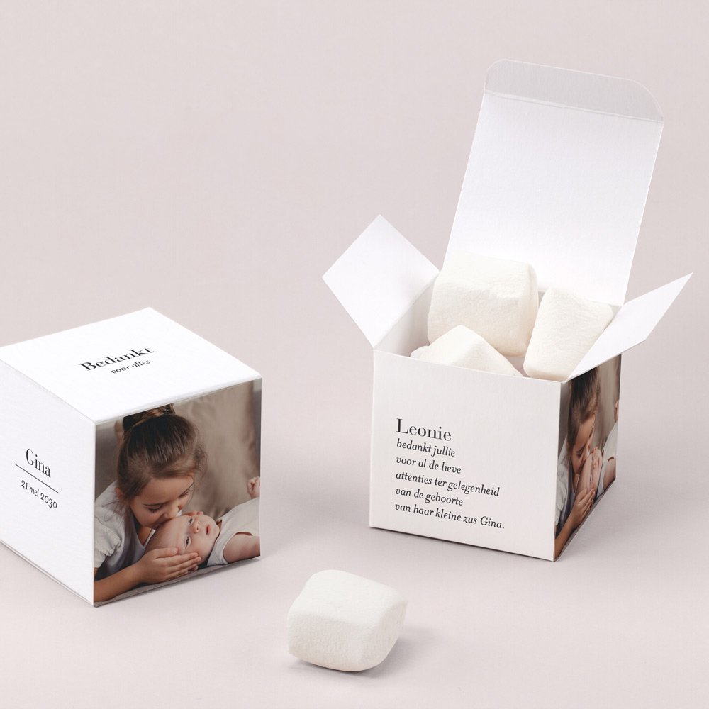 Een verrassingsdoosje als cadeautje voor je familie en vrienden, een mooie herinnering aan de geboorte van jullie kleine. Een kleine kubus van 5,4 x 5,4 cm waarin verschillende soorten lekkernijen kunnen. Laat je creativiteit de vrije loop!