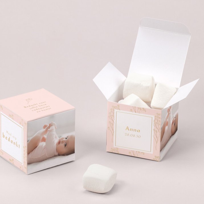 Een verrassingsdoosje als cadeautje voor je familie en vrienden, een mooie herinnering aan de geboorte van jullie kleine. Een kleine kubus van 5,4 x 5,4 cm waarin verschillende soorten lekkernijen kunnen. Laat je creativiteit de vrije loop!