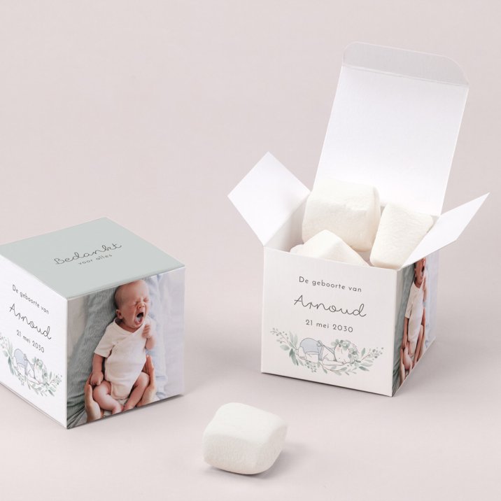 Een verrassingsdoosje als cadeautje voor je familie en vrienden, een mooie herinnering aan de geboorte van jullie kleine. Een kleine kubus van 5,4 x 5,4 cm waarin verschillende soorten lekkernijen kunnen. Laat je creativiteit de vrije loop!