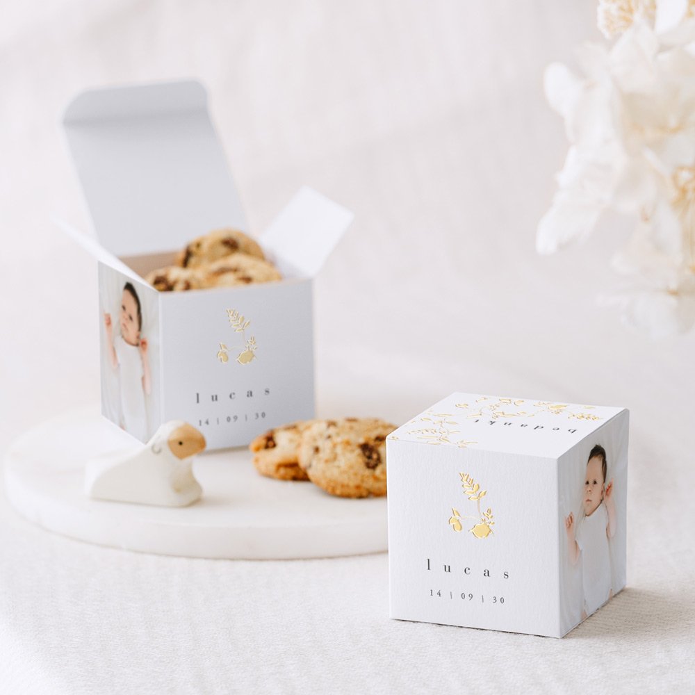 Een verrassingsdoosje als cadeautje voor je familie en vrienden, een mooie herinnering aan de geboorte van jullie kleine. Een kleine kubus van 5,4 x 5,4 cm waarin verschillende soorten lekkernijen kunnen. Laat je creativiteit de vrije loop!