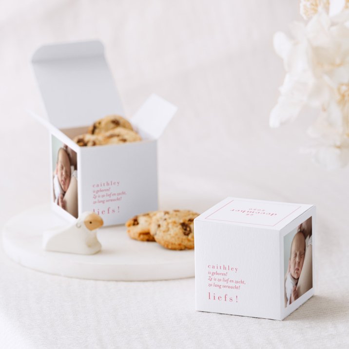 Een verrassingsdoosje als cadeautje voor je familie en vrienden, een mooie herinnering aan de geboorte van jullie kleine. Een kleine kubus van 5,4 x 5,4 cm waarin verschillende soorten lekkernijen kunnen. Laat je creativiteit de vrije loop!