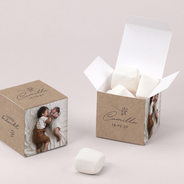 Een verrassingsdoosje als cadeautje voor je familie en vrienden, een mooie herinnering aan de geboorte van jullie kleine. Een kleine kubus van 5,4 x 5,4 cm waarin verschillende soorten lekkernijen kunnen. Laat je creativiteit de vrije loop!