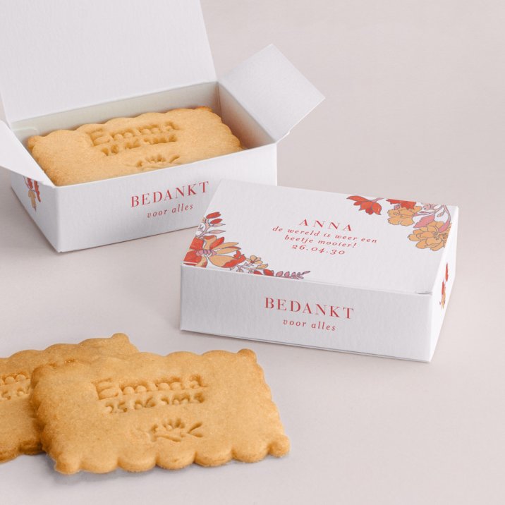 De koekjesdoos is speciaal ontworpen en gemaakt om jullie kraamvisite te verrassen met een smakelijk cadeautje! Personaliseer het doosje met een lief berichtje, foto of naam van de baby.In 1 doosje kunnen 3 of 4 koekjes, afhangend van de dikte van het koekje.