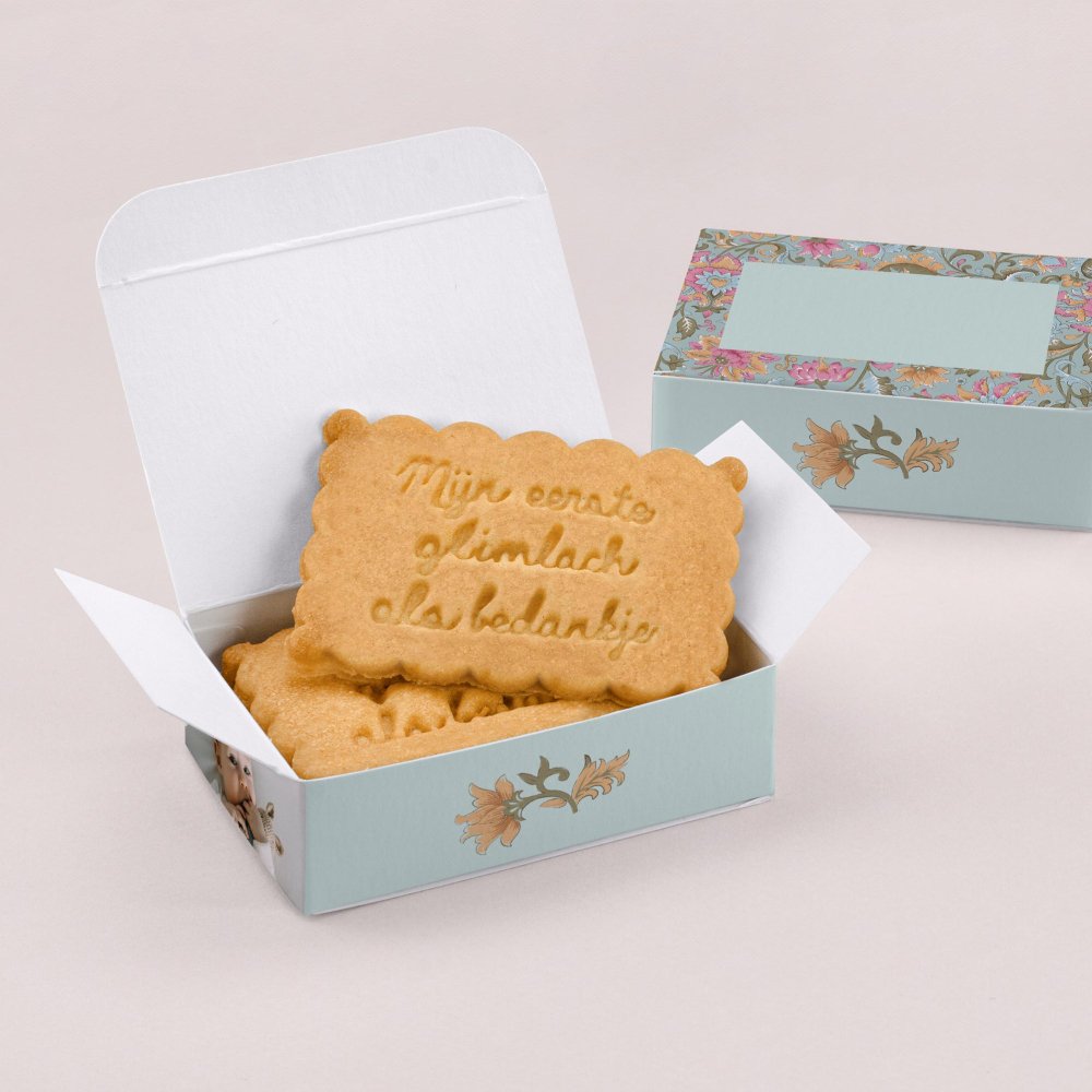 De koekjesdoos is speciaal ontworpen en gemaakt om jullie kraamvisite te verrassen met een smakelijk cadeautje! Personaliseer het doosje met een lief berichtje, foto of naam van de baby.In 1 doosje kunnen 3 of 4 koekjes, afhangend van de dikte van het koekje.