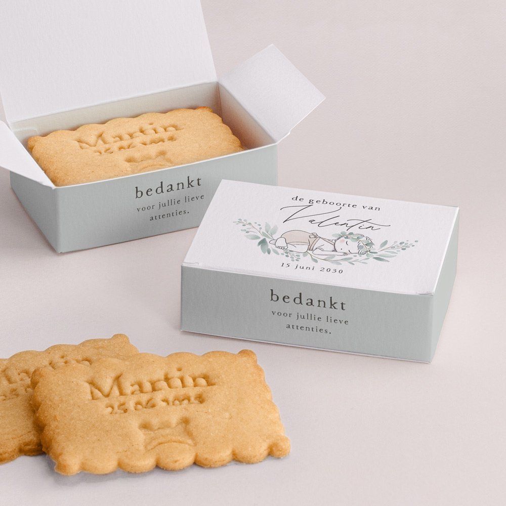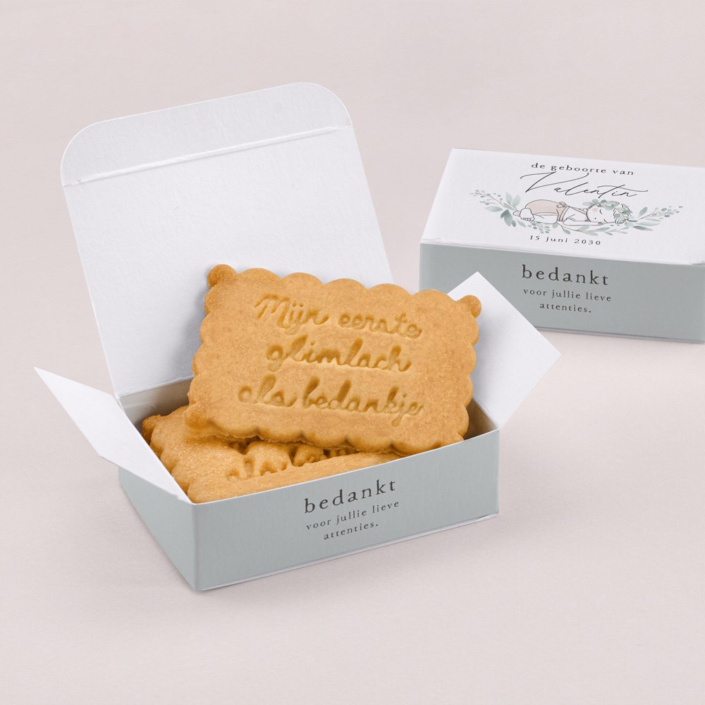 De koekjesdoos is speciaal ontworpen en gemaakt om jullie kraamvisite te verrassen met een smakelijk cadeautje! Personaliseer het doosje met een lief berichtje, foto of naam van de baby.In 1 doosje kunnen 3 of 4 koekjes, afhangend van de dikte van het koekje.