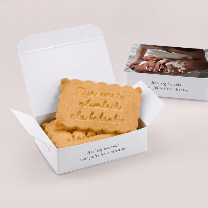 De koekjesdoos is speciaal ontworpen en gemaakt om jullie kraamvisite te verrassen met een smakelijk cadeautje! Personaliseer het doosje met een lief berichtje, foto of naam van de baby.In 1 doosje kunnen 3 of 4 koekjes, afhangend van de dikte van het koekje.