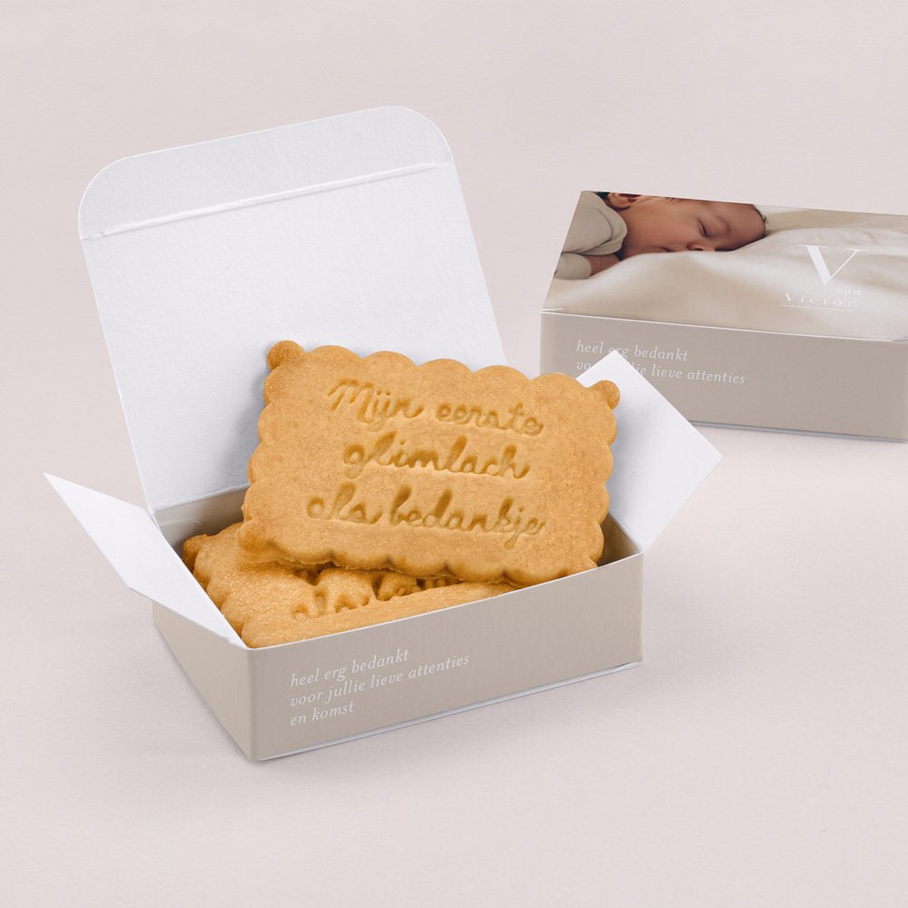 De koekjesdoos is speciaal ontworpen en gemaakt om jullie kraamvisite te verrassen met een smakelijk cadeautje! Personaliseer het doosje met een lief berichtje, foto of naam van de baby.In 1 doosje kunnen 3 of 4 koekjes, afhangend van de dikte van het koekje.