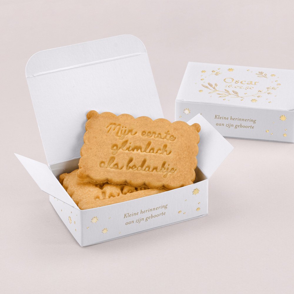 De koekjesdoos is speciaal ontworpen en gemaakt om jullie kraamvisite te verrassen met een smakelijk cadeautje! Personaliseer het doosje met een lief berichtje, foto of naam van de baby.In 1 doosje kunnen 3 of 4 koekjes, afhangend van de dikte van het koekje.
