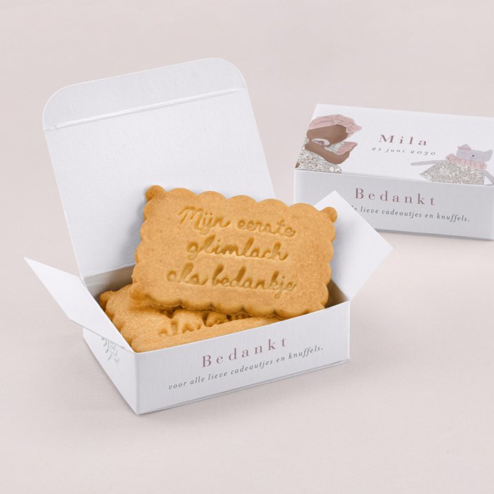 De koekjesdoos is speciaal ontworpen en gemaakt om jullie kraamvisite te verrassen met een smakelijk cadeautje! Personaliseer het doosje met een lief berichtje, foto of naam van de baby.In 1 doosje kunnen 3 of 4 koekjes, afhangend van de dikte van het koekje.