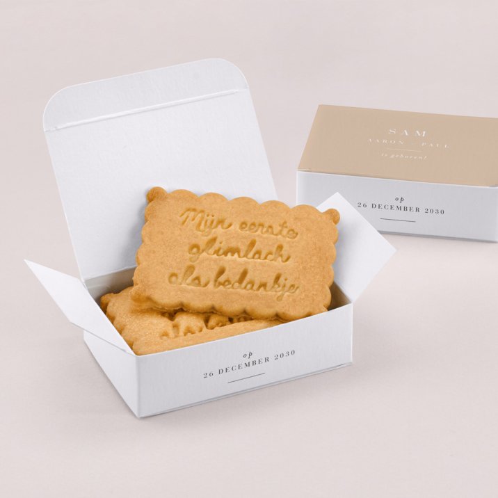 De koekjesdoos is speciaal ontworpen en gemaakt om jullie kraamvisite te verrassen met een smakelijk cadeautje! Personaliseer het doosje met een lief berichtje, foto of naam van de baby.In 1 doosje kunnen 3 of 4 koekjes, afhangend van de dikte van het koekje.