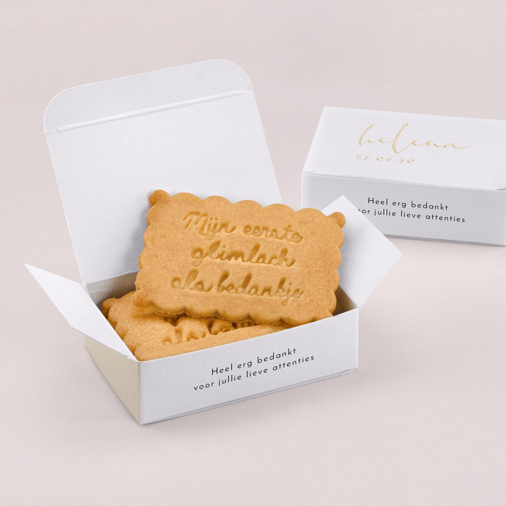 De koekjesdoos is speciaal ontworpen en gemaakt om jullie kraamvisite te verrassen met een smakelijk cadeautje! Personaliseer het doosje met een lief berichtje, foto of naam van de baby.In 1 doosje kunnen 3 of 4 koekjes, afhangend van de dikte van het koekje.