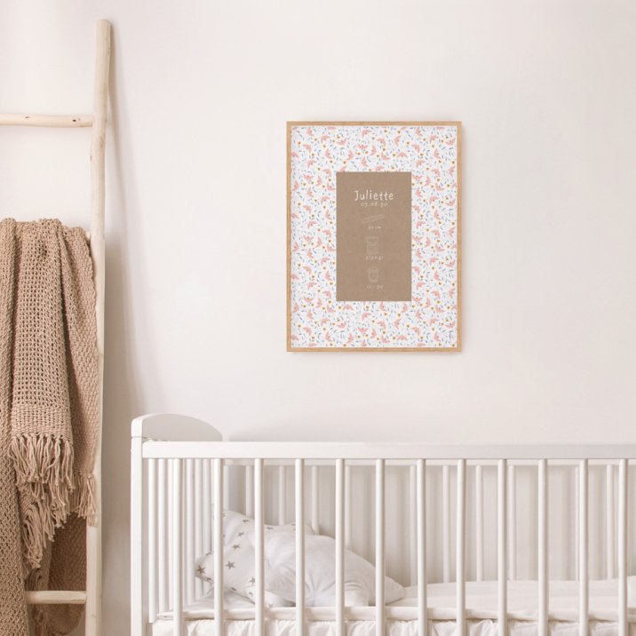 Een poster met een mooie illustratie, zijn/haar voornaam, maat, gewicht, evenals het tijdstip en de dag van de geboorte!