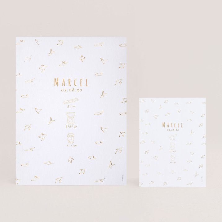 Een poster met een mooie illustratie, zijn/haar voornaam, maat, gewicht, evenals het tijdstip en de dag van de geboorte!