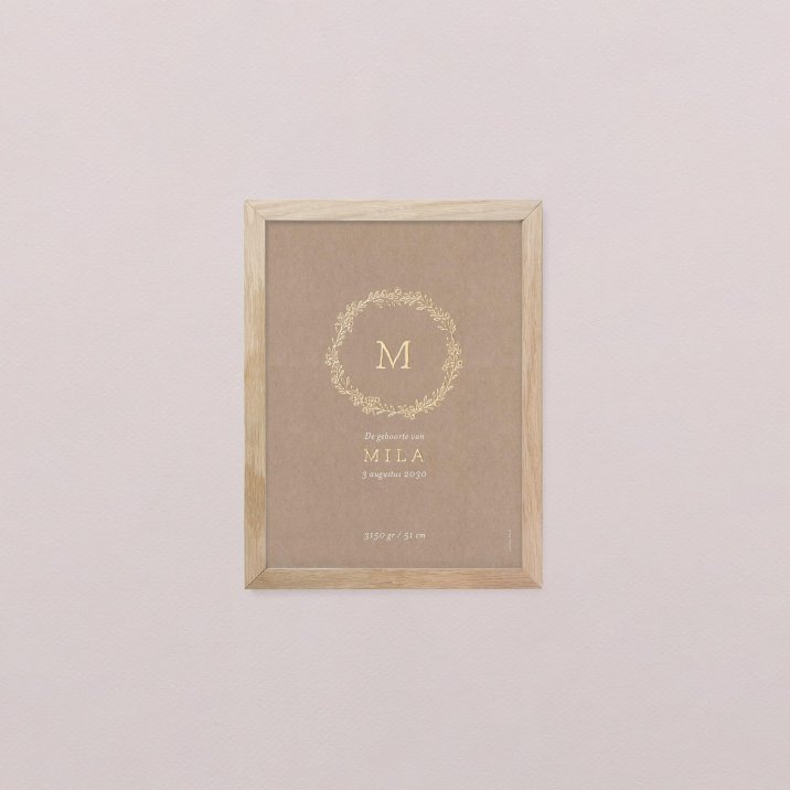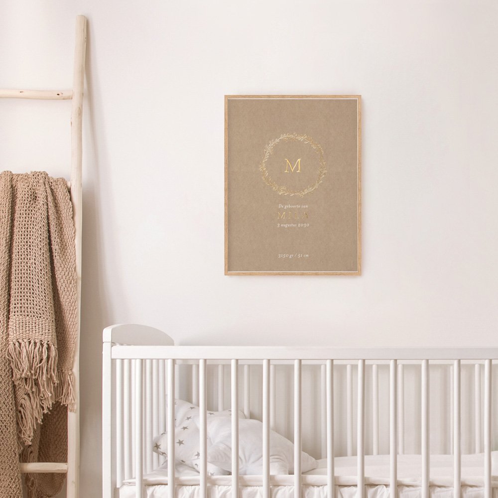 Een poster met een mooie illustratie, zijn/haar voornaam, maat, gewicht, evenals het tijdstip en de dag van de geboorte!