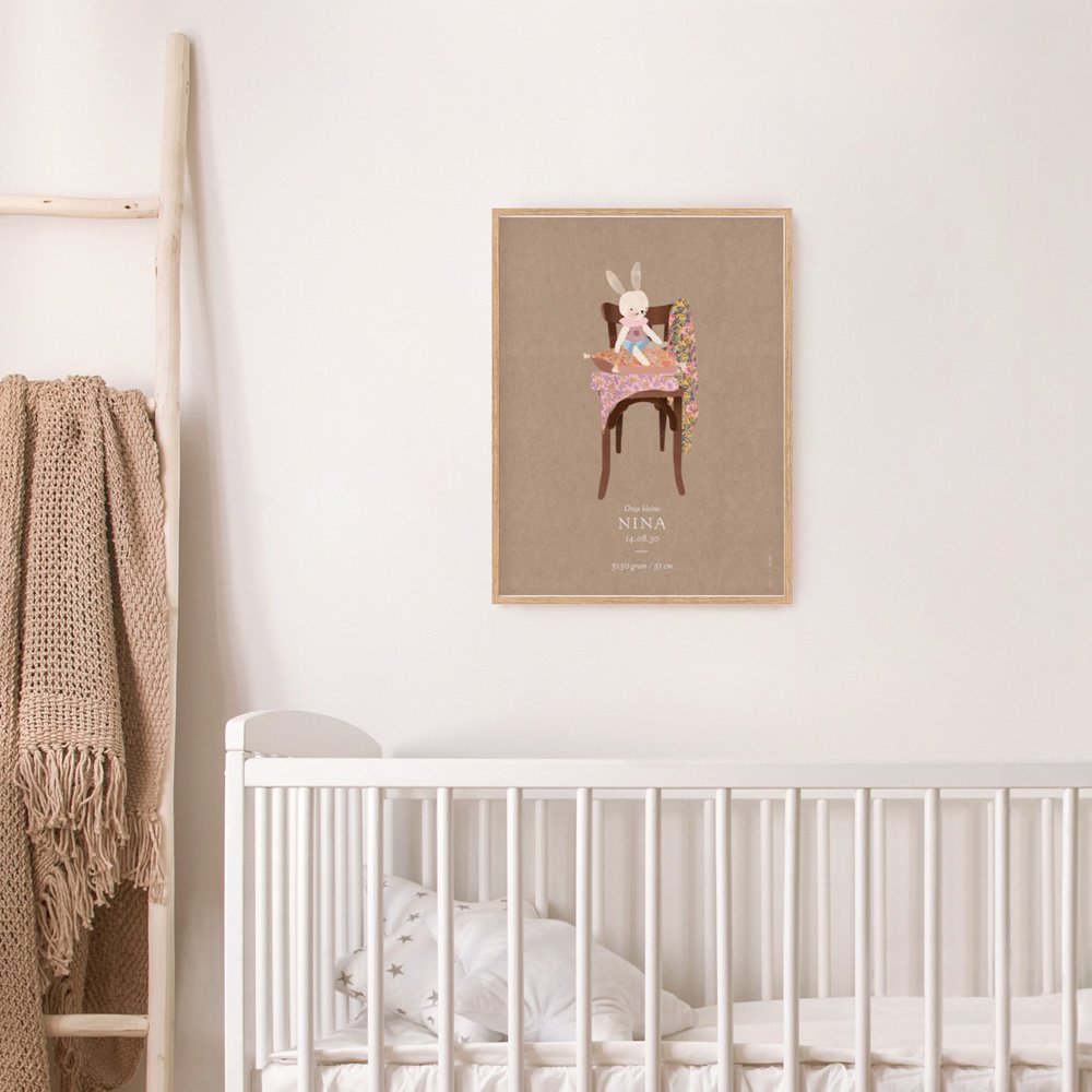 Een poster met een mooie illustratie, zijn/haar voornaam, maat, gewicht, evenals het tijdstip en de dag van de geboorte!