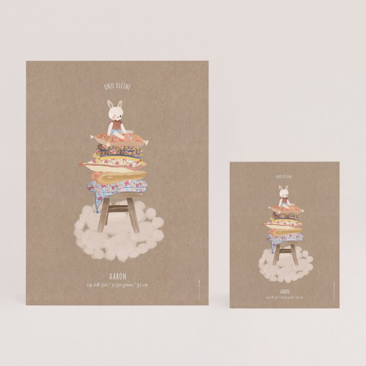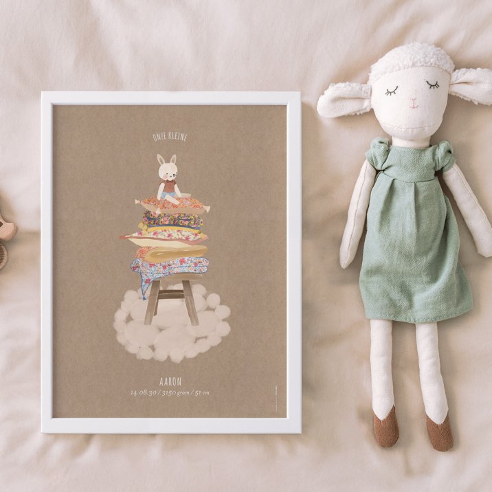 Een poster met een mooie illustratie, zijn/haar voornaam, maat, gewicht, evenals het tijdstip en de dag van de geboorte!