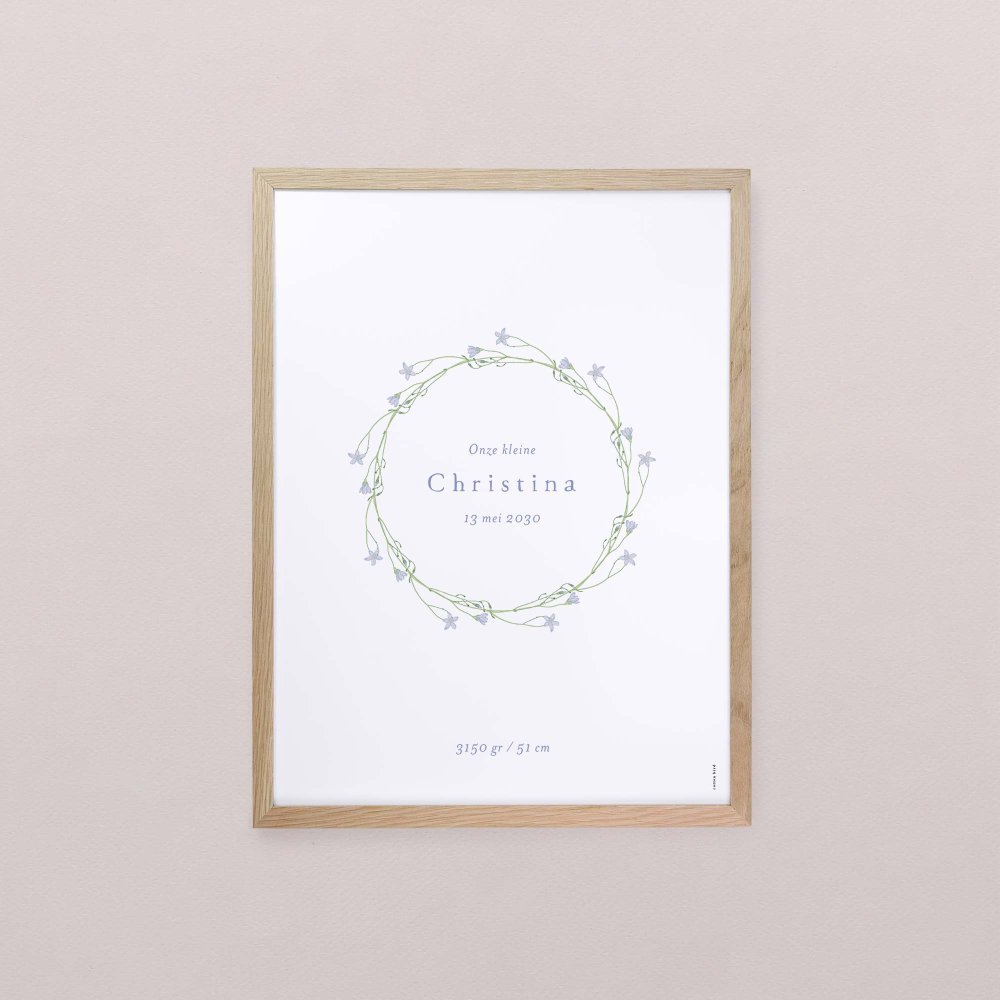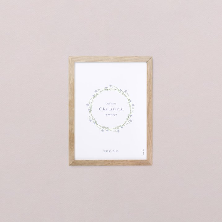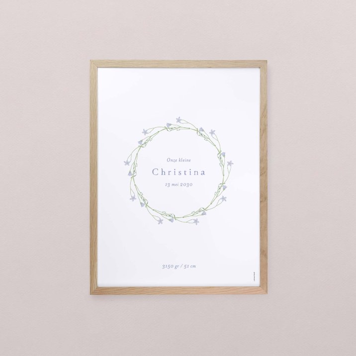 Een poster met een mooie illustratie, zijn/haar voornaam, maat, gewicht, evenals het tijdstip en de dag van de geboorte!