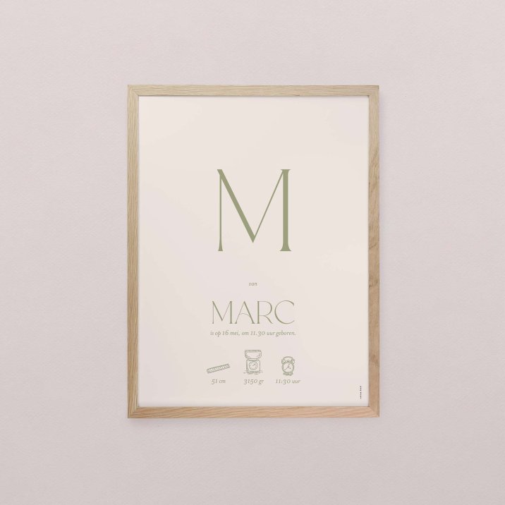 Een poster met een mooie illustratie, zijn/haar voornaam, maat, gewicht, evenals het tijdstip en de dag van de geboorte!
