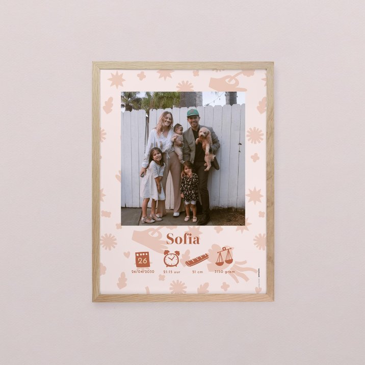 Een poster met een mooie illustratie, zijn/haar voornaam, maat, gewicht, evenals het tijdstip en de dag van de geboorte!