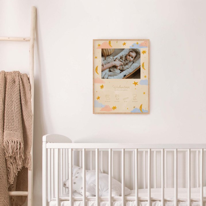 Een poster met een mooie illustratie, zijn/haar voornaam, maat, gewicht, evenals het tijdstip en de dag van de geboorte!