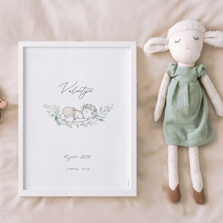 Versier de babykamer op de meest schattige manier met een poster in hetzelfde design als het geboortekaartje van je uk! Ga voor de Baptistin-poster en zijn tedere illustratie van een slapende baby ...