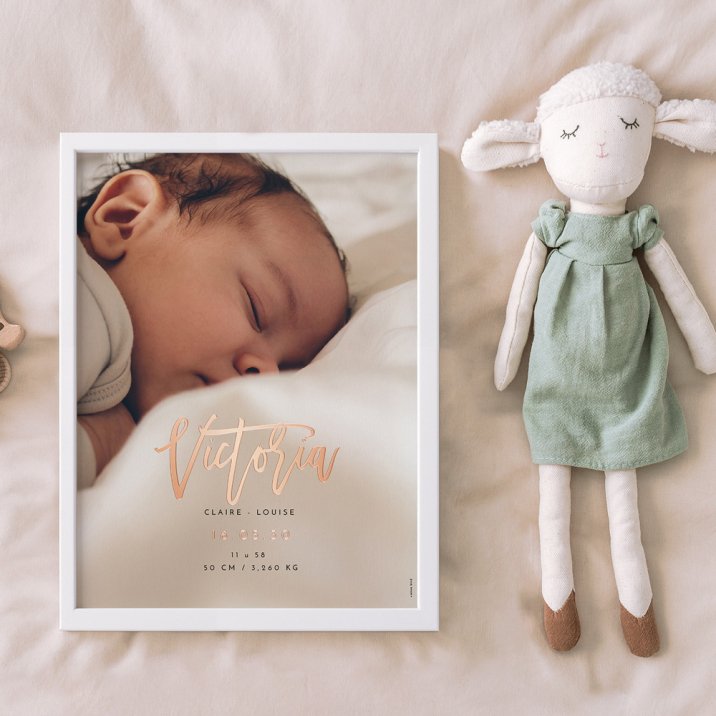 Personaliseer de poster met de voornaam, lengte, gewicht, evenals het tijdstip en de dag van de geboorte van je kleine uk.