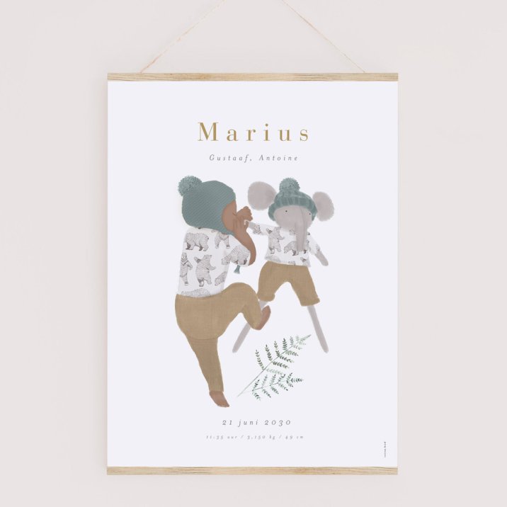 Jij bent helemaal vrij in de keuze van wat er op de geboorteposter komt te staan. Onze ontwerpers hebben verschillende designs gemaakt waar je uit kunt kiezen. Natuurlijk staat de naam van jouw baby er op, net als de geboortedatum. Daarnaast worden vaak de algemene geboortegegevens, zoals het geboortegewicht, de lengte van je baby en het tijdstip van de geboorte, ook regelmatig op de poster gezet. Wil jij bijvoorbeeld ook de geboortedag, geboorteplaats en jullie eigen namen op de poster vermelden als leuke herinnering? Dan is dit soms mogelijk.