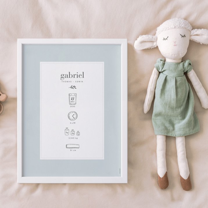 Als je op zoek bent naar een eenvoudig ontwerp met gekke charme, dan zal de Azur Sketch poster je zeker verleiden... Het onthult in een paar pictogrammen de belangrijkste details van de geboorte van je baby: zijn voornaam, zijn gewicht, zijn grootte, evenals de tijd en datum van zijn eerste kreet!