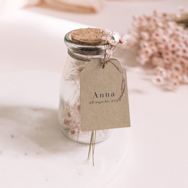 De labels worden geperforeerd geleverd; we raden aan om een paar takjes gedroogde bloemen door de perforaties te halen zodat jouw bedankjes of cadeautjes een persoonlijke en unieke look krijgen.