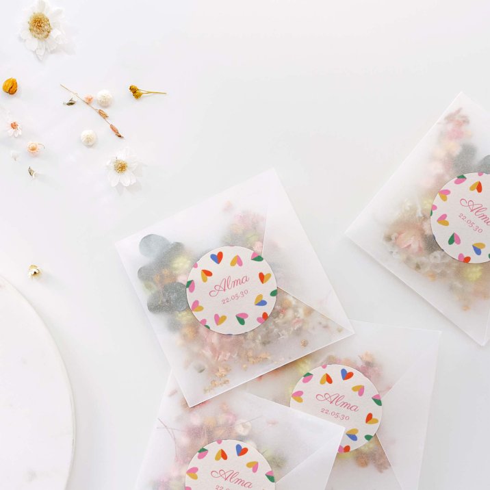 Klein stickertje om je enveloppen te versieren. Een mooi cadeau voor je familie en vrienden, vooral met een leuke verrassing als een snoepdoosje met doopsuiker?