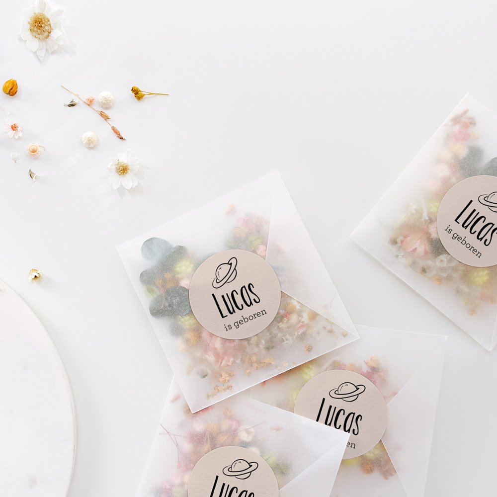 Klein stickertje om je enveloppen te versieren. Een mooi cadeau voor je familie en vrienden, vooral met een leuke verrassing als een snoepdoosje met doopsuiker?